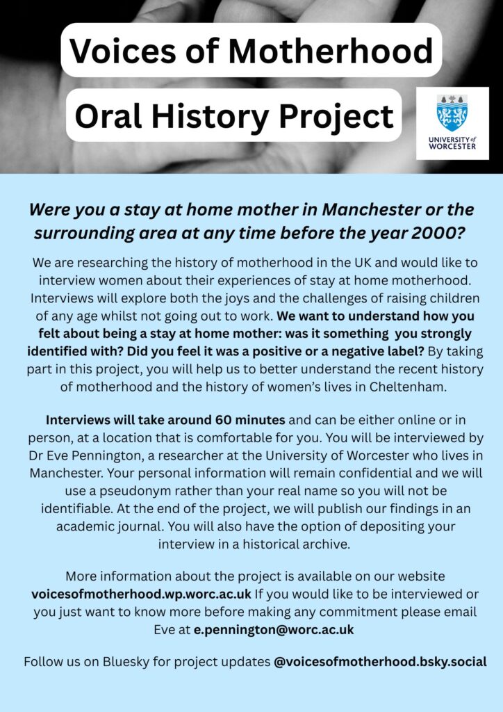 Please send abstracts of no more than 200 words and a short biography to voicesofmotherhood@worc.ac.uk by Saturday 1 November 2025. The conference will take place on Thursday 5 and Friday 6 February 2026 online; please indicate in your email if you will not be available on one of these two dates and we will do our best to accommodate this.